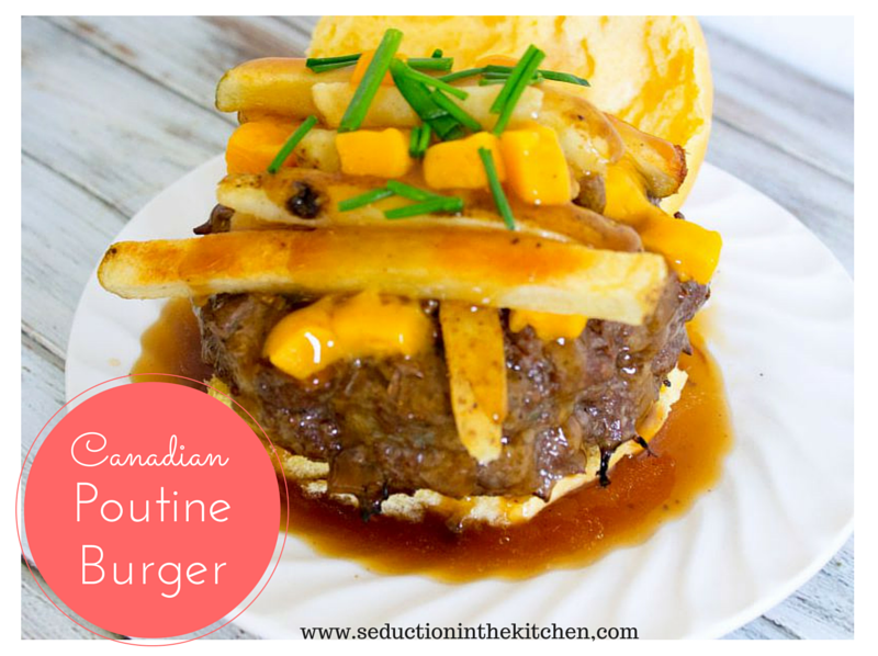 A burger with Canada influence! A mushroom and onion stuffed Angus burger with gravy, fries, and cheddar cheese. A recipe from Seduction in the Kitchen.