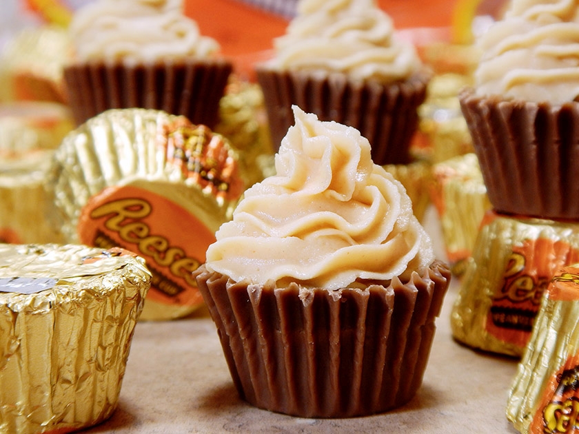 Reese’s peanut butter cups topped with frosting to look like cupcakes. These candy “cupcakes” make great toppers for real cupcakes and cakes.