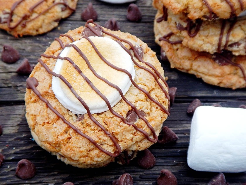 Soft and chewy graham-cracker based cookies packed with milk chocolate chips and topped with toasted marshmallows. Add a chocolate drizzle for an extra special touch.